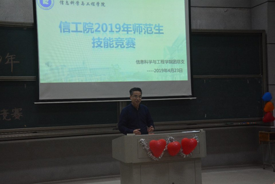 (通讯员 邓力超 肖丽菲)为强化伟德官网师范专业学生的教师职业技能,提高师范生教育教学能力,进一步促使广大同学更新教育理念和激发其掌握现代教学方法的热情,信息科学与工程学院于2019年4月16日—4月23日成功举办2019年师范生教师技能竞赛。并于4月23日下午6:30—22:00在润寰南106进行了现场授课决赛。学院副院长田祖伟教授、党总支副书记易利老师、学工办主任关鸿儒老师及学院教师代表阳西述教授、何昭青教授、何向阳教授、黄悦副教授和刘琳老师出席比赛并担任评委。