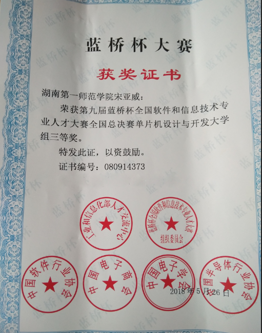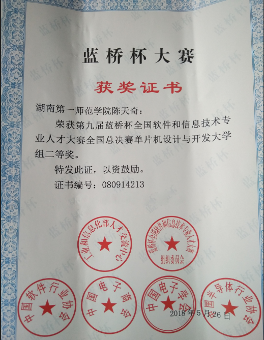 近日,第九届蓝桥杯全国软件和信息技术专业人才大赛全国总决赛在北京落下帷幕。来自北京大学、清华大学等1200多所高校的5000余名各省市自治区一等奖选手参加了全国总决赛。伟德国际英国信息科学与工程学院学生陈天奇在傅红普教授指导下荣获单片机设计与开发大学组二等奖、宋亚威在马重明教授的指导下荣获单片机设计与开发大学组三等奖。