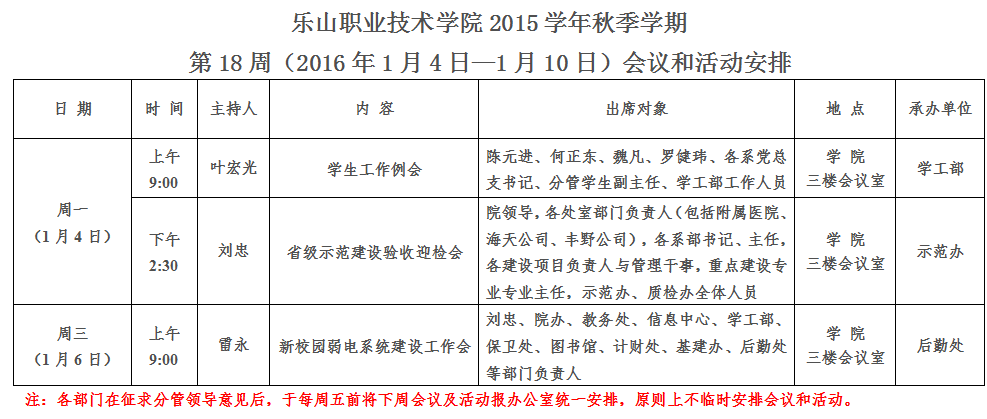 第18周(2016年1月4日-1月10日)会议和活动安排