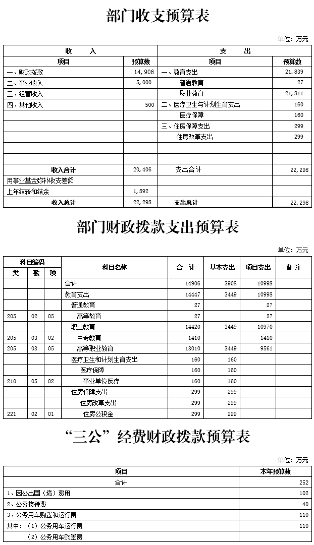 2015年学院收入预算总额为22298万元,其中:当年财政拨款收入14906万元,事业收入5500万元,上年结转收入1892万元。相应安排支出预算22298万元,其中:人员支出5585万元,日常公用支出1591万元(其中机关运行经费351万元),对个人和家庭的补助支出3000万元,专项支出12122万元。
