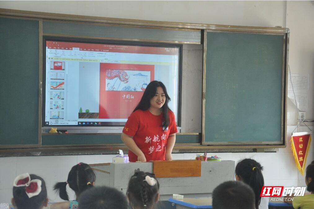 长塘仑小学位于湖南省益阳市资阳区迎风桥镇境内,资水之阳,三区之交,树木树人,葱郁垂阴,迎风起舞,“E起”同行。如今,20多名志愿者带着“红色一师”的革命传统和教育传统,用自己的学科知识,结合建党百年的时代背景和红色故事,为82名小学生带来了别开生面的红色课程。《大郭小郭行军郭》《中国红》《纪念碑下的小花》等课上,孩子们兴趣浓厚。