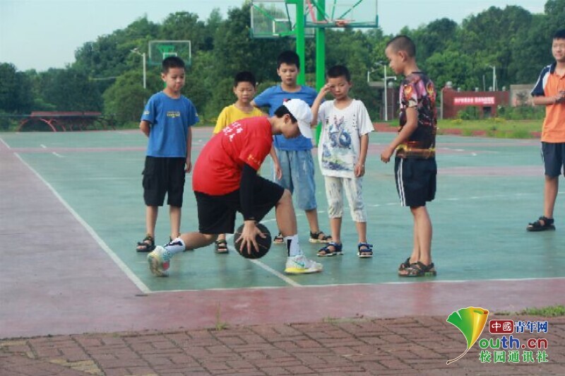 图为队员在体育课上认真地示范篮球“三步上篮”,小朋友们围住队员,眼神中满是敬佩。中国青年网通讯员 何星逸 摄