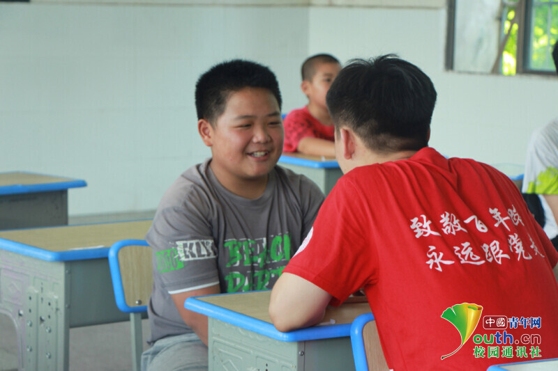 图为体育课上新航向·梦之队志愿者与“七彩假期”公益暑托班的孩子们分享课余生活。中国青年网通讯员 何星逸 摄