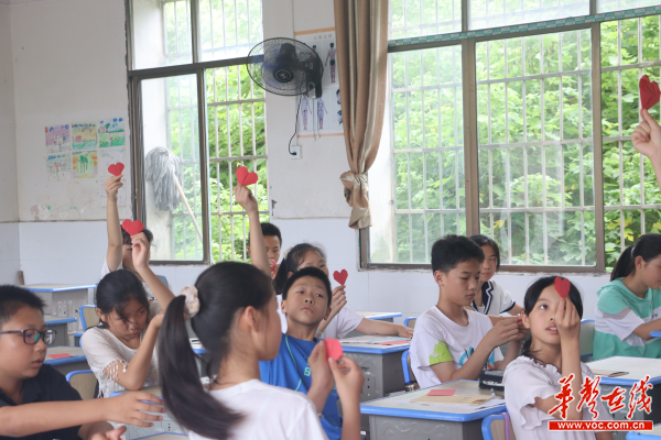 在手工课堂上,“老师”首先向孩子们介绍折纸的背景。然后认真讲解折纸步骤并亲身演示如何将一张张彩纸折成一个个小红心,在“老师”详细的讲解后,孩子们迫不及待地开始折纸,课后纷纷涌上讲台,展示自己的红心作品。