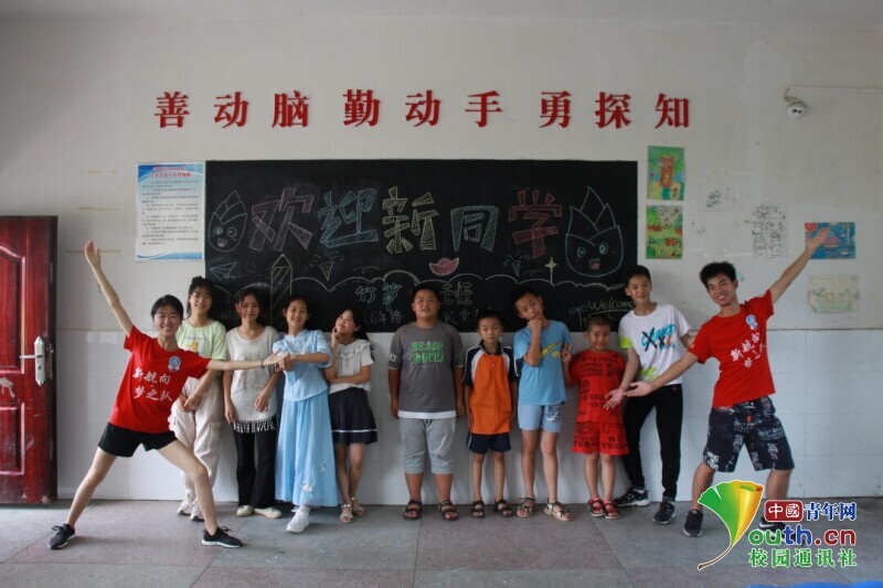 图为两位大班班主任与同学们在黑板前的合影。中国青年网通讯员 欧阳健 摄