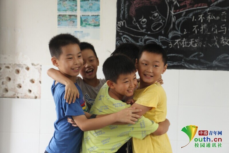 图为在志愿者老师组织玩爱的抱抱时,五个小朋友迅速的抱在一起。中国青年网通讯员 欧阳健 摄