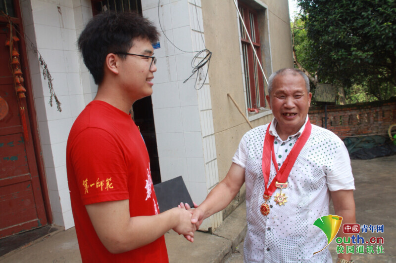 图为新航向·梦之队预备党员志愿者与老党员握手交流。中国青年网通讯员 欧阳健 摄