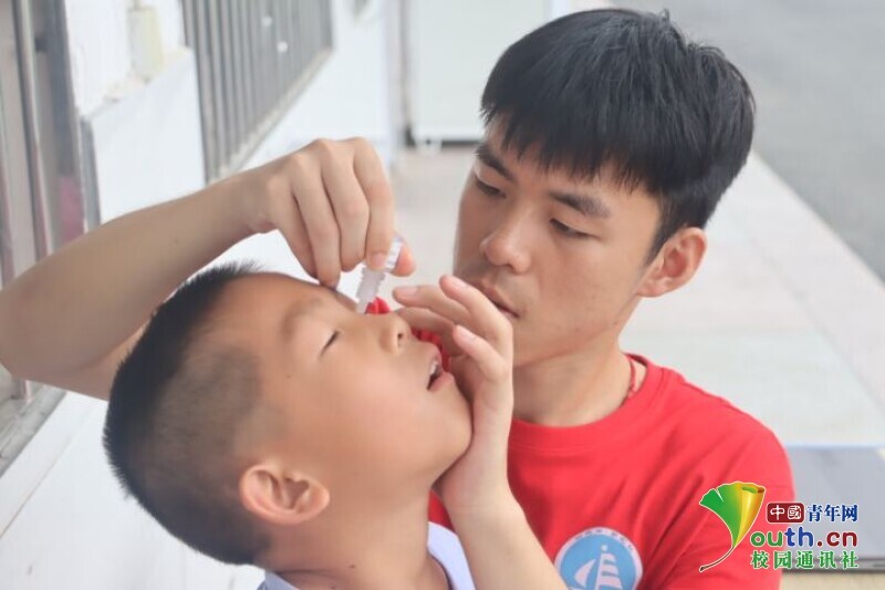 图为患眼疾的孩子需要每隔一小时点一次眼药水,队员正在小心翼翼地给他点眼药水。 中国青年网通讯员 段新利 摄