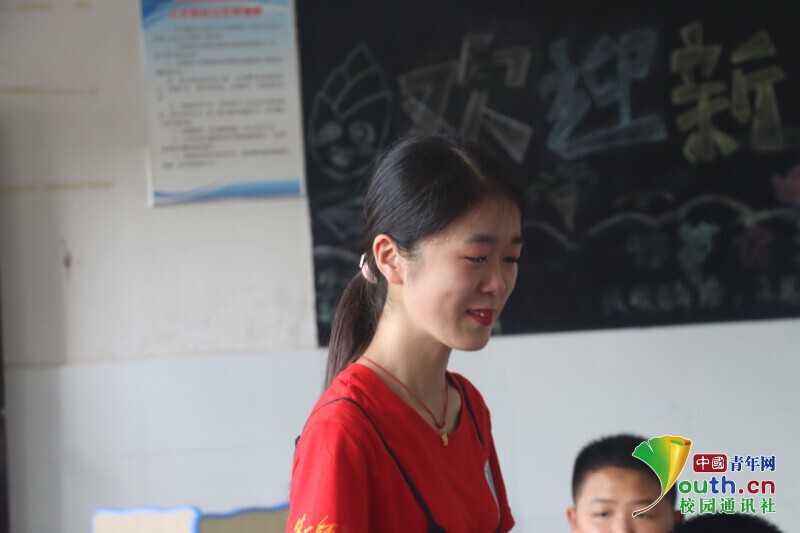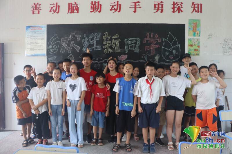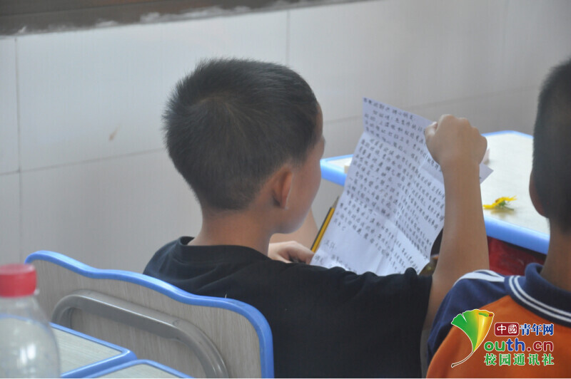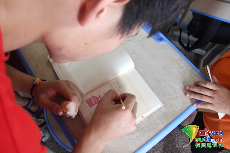 图为志愿者正在为孩子们写祝福和留言的场景,这是属于这个夏天的独一无二的记忆。中国青年网通讯员 欧阳健 摄