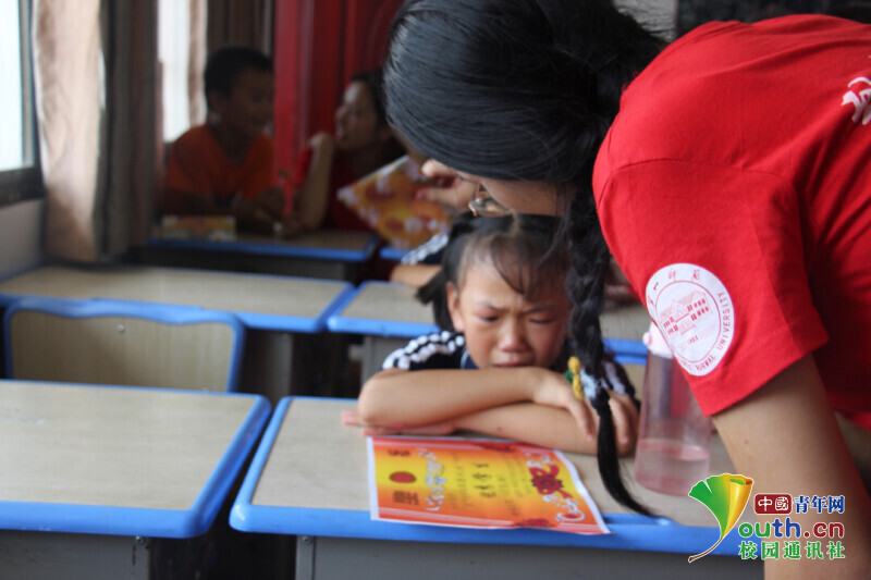 图为志愿者在安慰伤心不舍分别的孩子。中国青年网通讯员 欧阳健 摄
