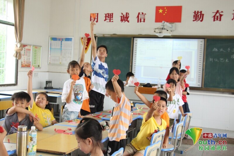 图为手工课上,学生高举自己做好的小爱心展示给老师看。中国青年网通讯员 何星逸 摄