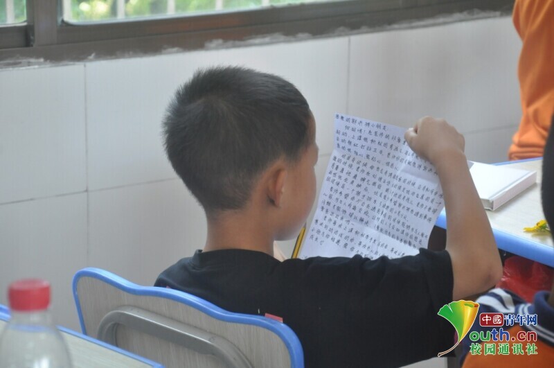 图为学生迫不及待的打开老师们写的信,想知道老师对他说了什么。中国青年网通讯员 何星逸 摄