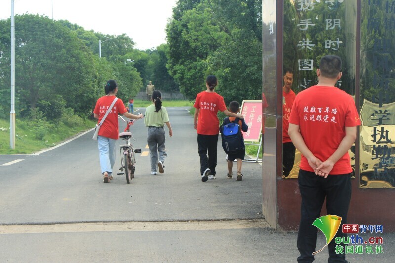 图为新航向·梦之队队员在校门口接引孩子进入校园。中国青年网通讯员 何星逸 摄