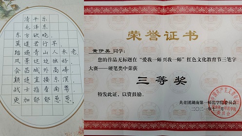 此次红色文化教育节还包括三笔字比赛、征文比赛、摄影比赛。获奖优秀作品在颁奖典礼现场陈列展出。伟德官网19级818教技班李文豪的摄影二等奖作品《钟楼的故事》,20级848教技班黄伊美的三笔字(硬笔)比赛三等奖作品《清平乐》陈列其中。