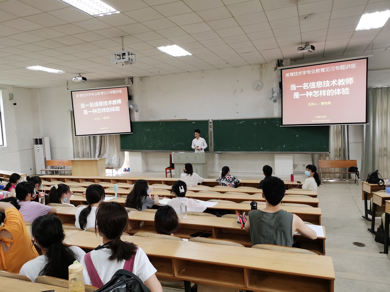 2022年4月12日,2016届优秀毕业生曹向荣受邀在玉衡南201为伟德官网教育技术学专业学生开展《当信息技术教师是一种怎样的体验》教育见习专题讲座。副院长何向阳、教育见习指导老师、教育技术系部分老师、20教技1班、21级教技881及882班全体同学参加了讲座。讲座由教育技术系副主任刘琳主持,