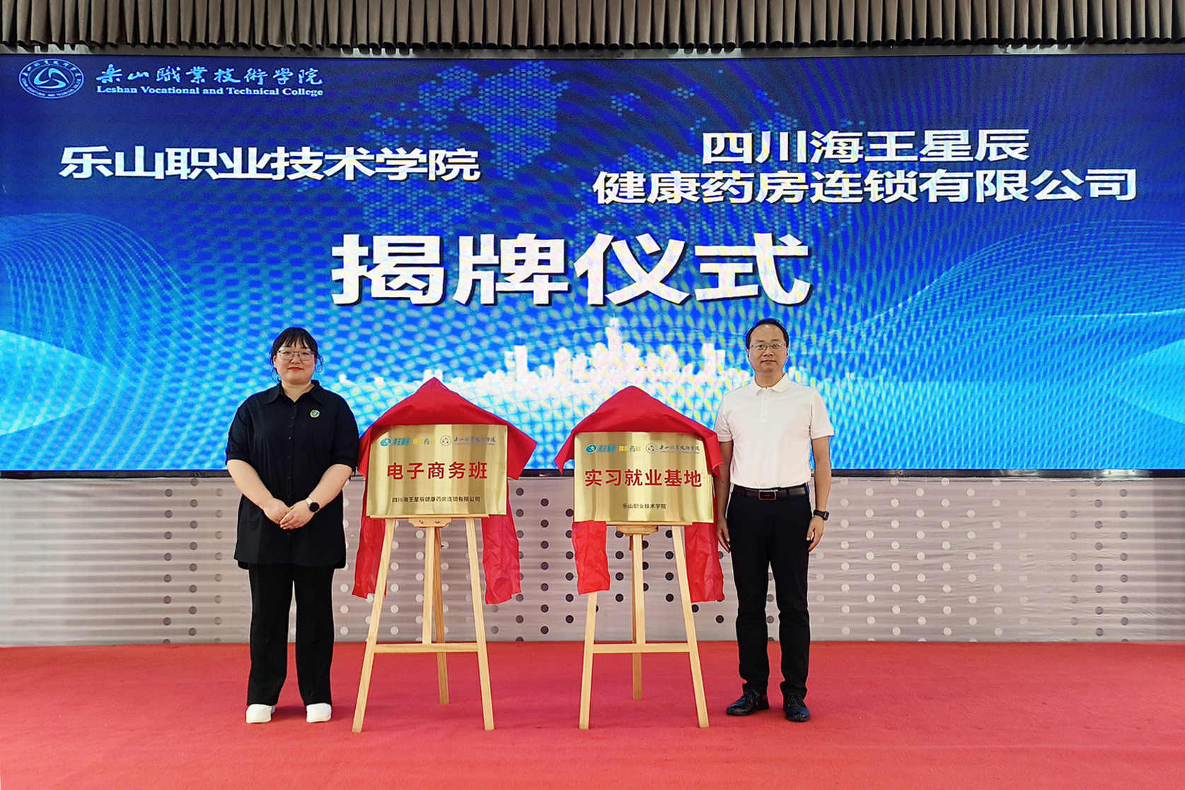开班仪式上,张佳和王芳相共同为“海王星辰电子商务班”和“乐山职业技术校外实践教学基地”揭牌,为“海王星辰电子商务班”学员授予班徽和定制笔记本。beat365英国官方网站毕业生、海王星辰优秀员工林静和“海王星辰电子商务班”学生代表汪怡莲作了发言。