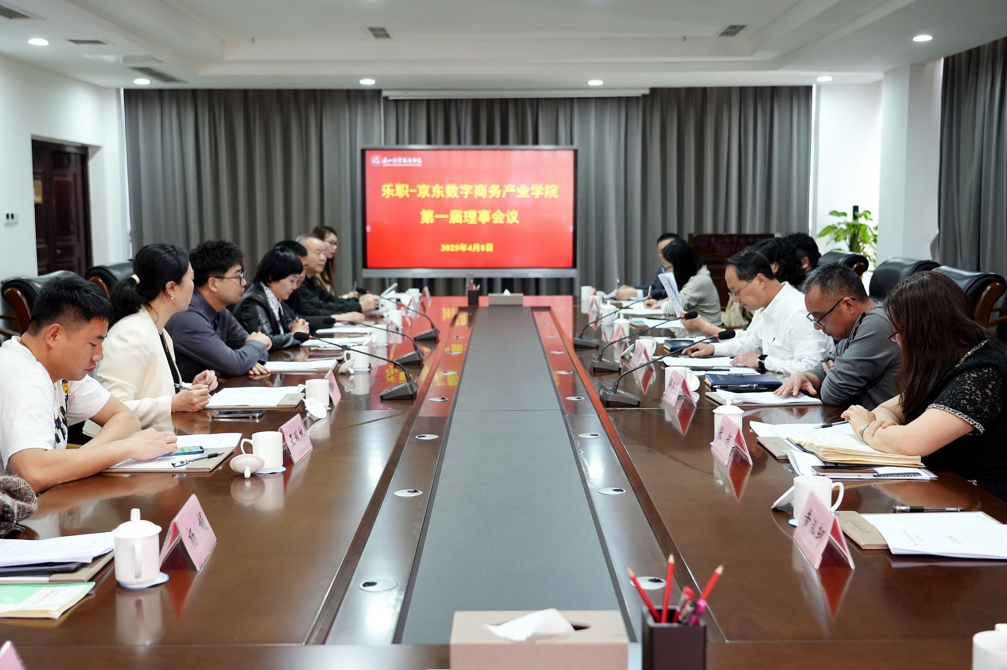 2025年4月8日,乐职-京东数字商务产业学院(以下简称产业学院)第一届理事会在学术交流中心2001会议室召开。学校党委副书记、工会主席张佳,江苏京东信息技术有限公司校企合作西南区负责人金星星出席,教务处、后勤处、国资处、计财处、国有公司负责人,数字经济与管理学院、京东相关人员参加会议。