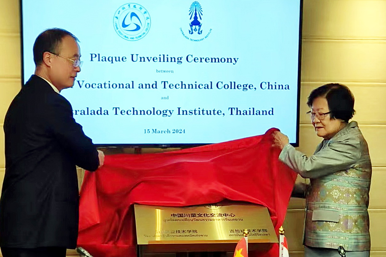 访问期间,刘忠代表学校为beat365老挝毕业生Mr.Laochu Bounthong创办的LC语言学校授牌“beat365英国官方网站来华留学生生源基地”,与泰国皇家吉拉达泰国皇家吉拉达学校校长Assoc. Prof. Khunying Sumonta Promboon一同为两校合作共建的“中国川菜文化交流中心”揭牌。