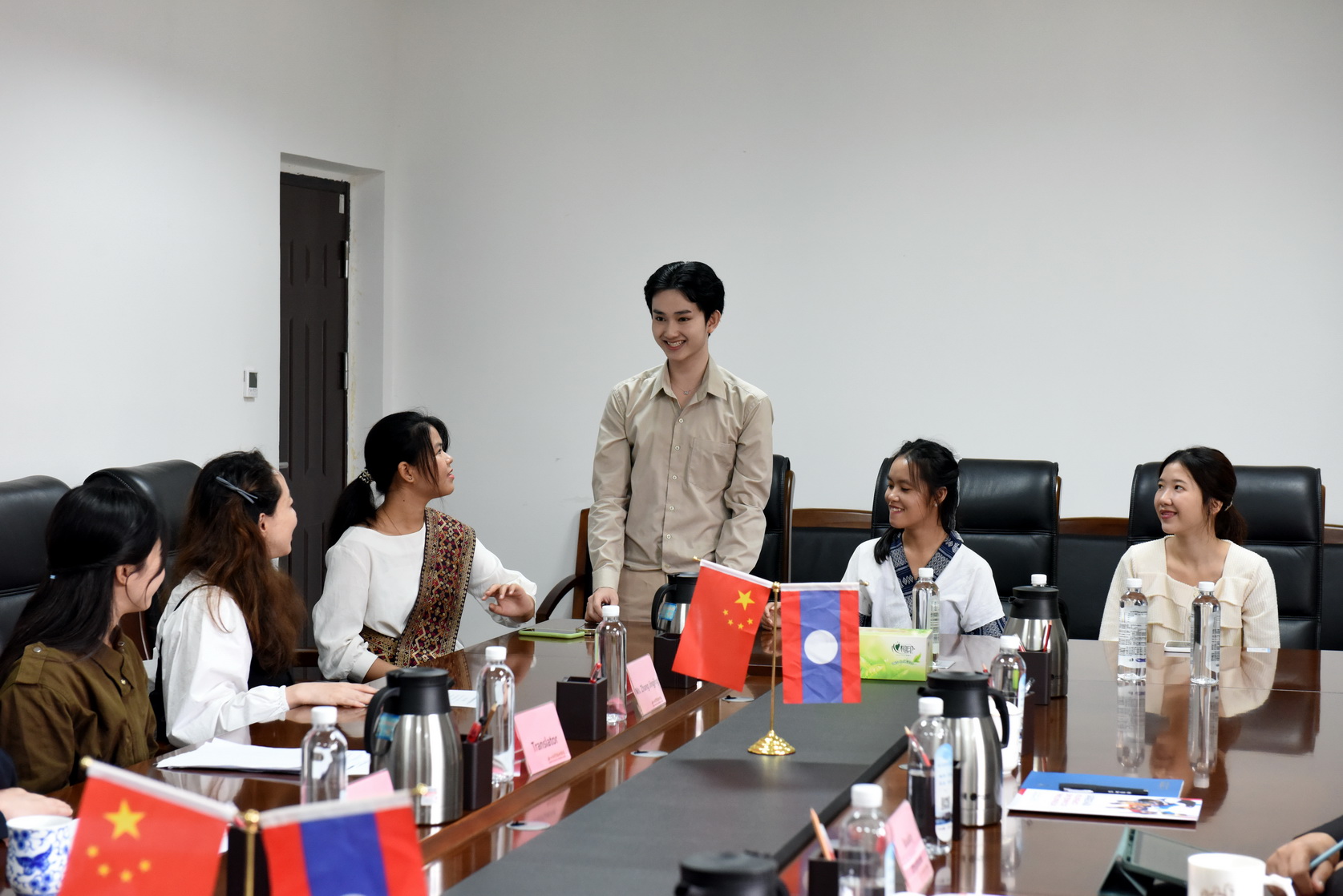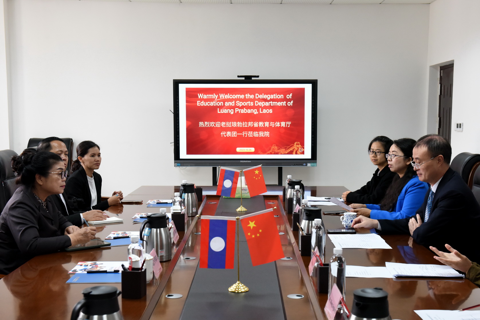 2023年10月25日,老挝琅勃拉邦省教育与体育厅副厅长布阿莱•伊蒂丰一行来校交流访问,实地考察学校学习生活环境,并与学校领导和留学生开展了交流座谈。校长刘忠,党委委员、副校长周芹,国际学院相关负责人及在校就读的琅勃拉邦省派送学生代表参加了交流座谈会,座谈会由周芹主持。