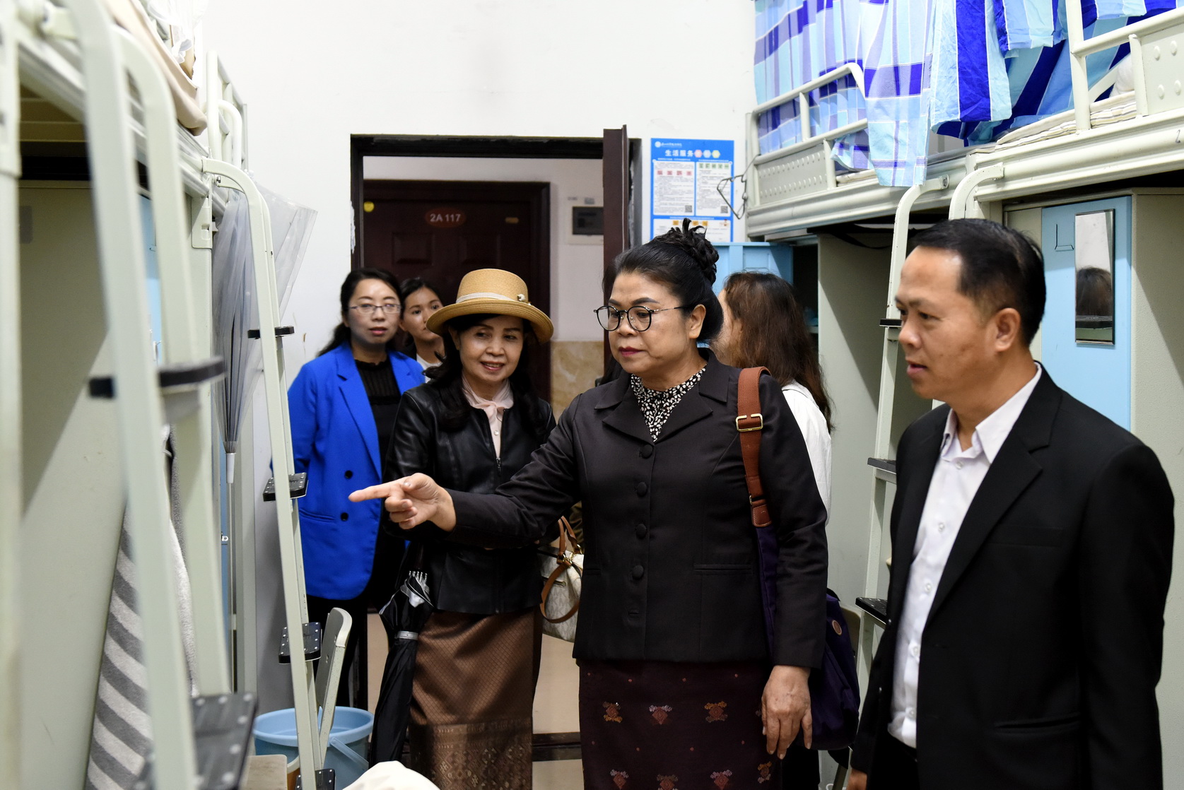 会前,周芹陪同老挝琅勃拉邦省教育与体育厅代表团一行参观考察了学生公寓、学生食堂、实训室、实习工厂等,还来到教室看望老挝琅勃拉邦省来校留学的2023级新生并与他们交流。