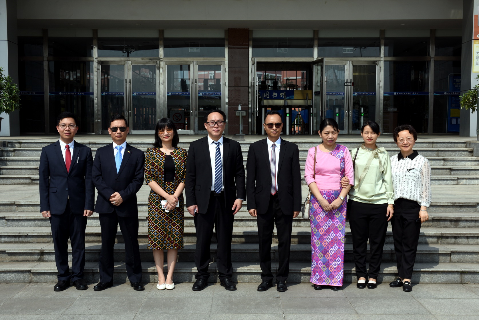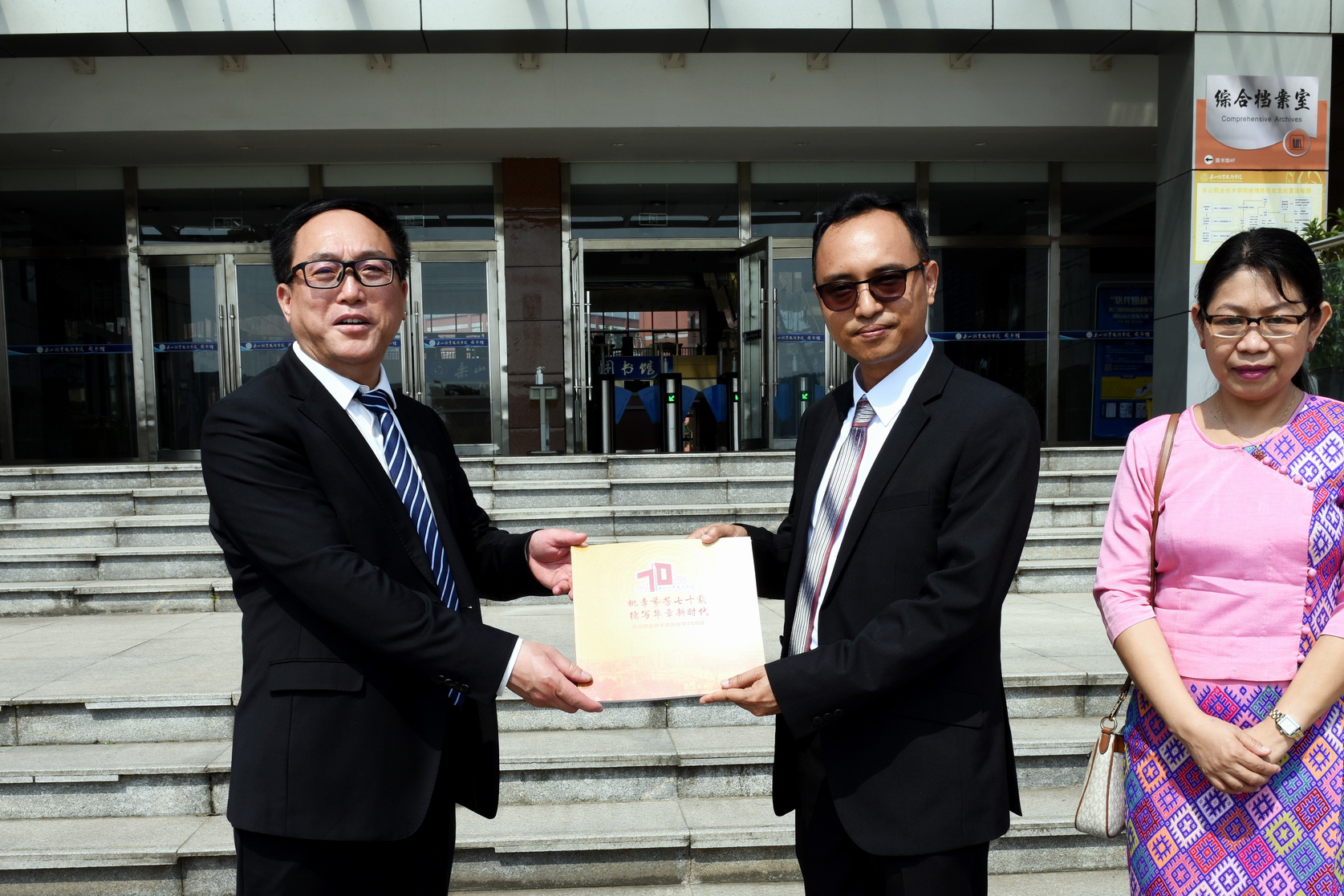 参观结束后,成定彬向总领事赠送了学院办学70周年纪念画册,宾主双方在图书馆前合影留念。