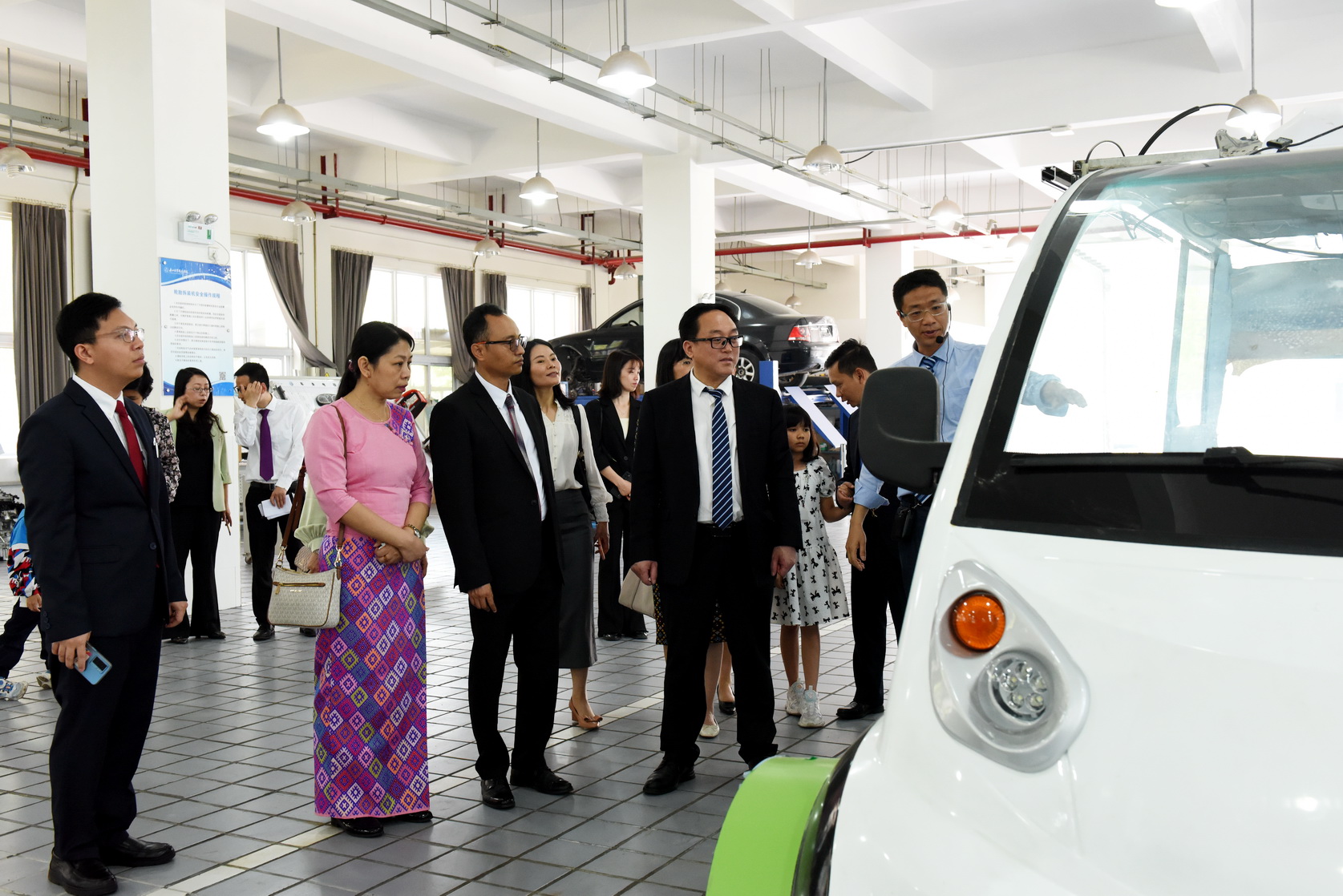 吕真才一行首先来到留学生教室观看留学生中国文化课展示,随后在学院礼堂观看了学院宣传片,在青江武术基地观看学生武术训练,在汽车检测与维修实训基地、工业机器人技术实训基地、多晶硅实训基地观看学生实训情况。