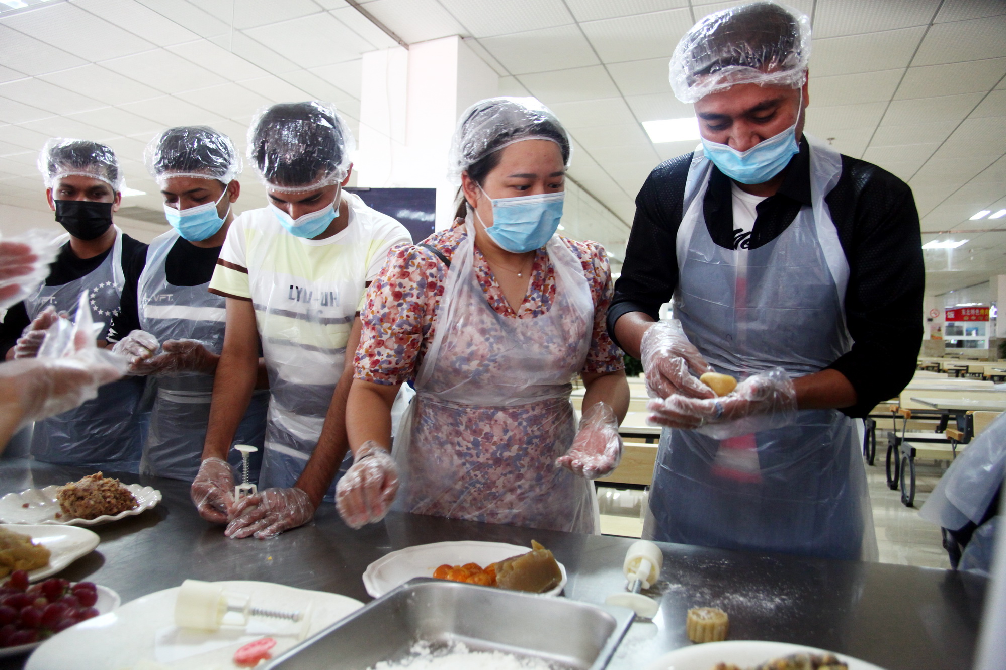 活动中,留学生在面点师的悉心指导下很快掌握了做皮、包馅、压模的技能,同学们学得有模有样,老师们在旁边悉心指导,看着一盘盘的劳动成果,大家脸上绽放出灿烂的笑容。听着京剧,品尝着自己亲手做的月饼,留学生们以饼寄相思,给远方的家人也发去了来自中国的祝福。