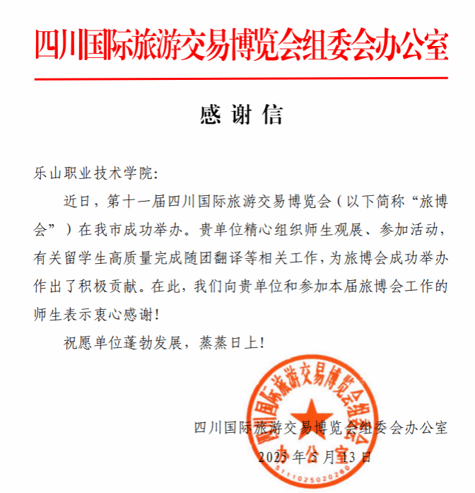 中共乐山市委外事工作委员会办公室及四川国际旅游交易博览会组委会办公室分别向beat365发来感谢信,对参与旅博会工作的学生表示衷心感谢,并对苏莉莎、林富丽等同学的优秀表现给予了高度赞赏。beat365来华留学生以实际行动诠释了奉献精神,为学校赢得了荣誉,也为beat365国际化办学增添了新的光彩。