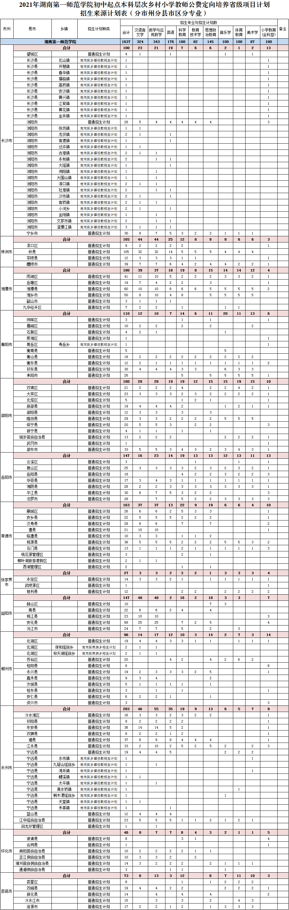 根据培养类型与培养目标的需要,我校招生计划设置普通招生计划(以下简称“普通计划”)、定向到乡镇任教招生计划(以下简称“乡镇计划”)、定向到民族乡招生计划(以下简称“民族乡计划”),具体如下: