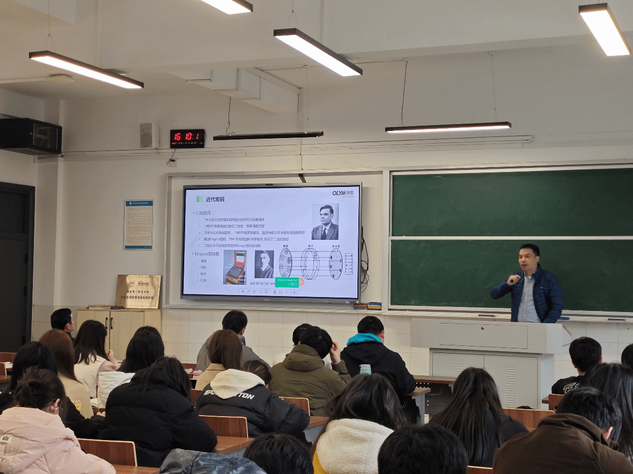 随后,程朝辉在玉衡楼503作题为密码技术演进、发展及标准化的专题讲座。他以历史脉络为主线,从古典密码的凯撒加密、二战时期的恩尼格玛密码机,讲到现代公钥体制、香农加密算法、数字信封与数字签名技术,最后延伸至量子计算挑战及我国SM系列算法的国际标准化进程。通过Target数据泄露事件、Juniper VPN漏洞等实际案例,程朝辉生动阐释了密码技术在数据安全中的关键作用,并展望了后量子密码、零知识证明等前沿技术的应用前景。在互动环节,他鼓励学生夯实数学与编程基础,关注国产密码技术发展,努力成长为通理论、精技术的复合型人才。讲座现场反响热烈,学生普遍表示对密码学的应用场景与职业发展有了更清晰的认知。