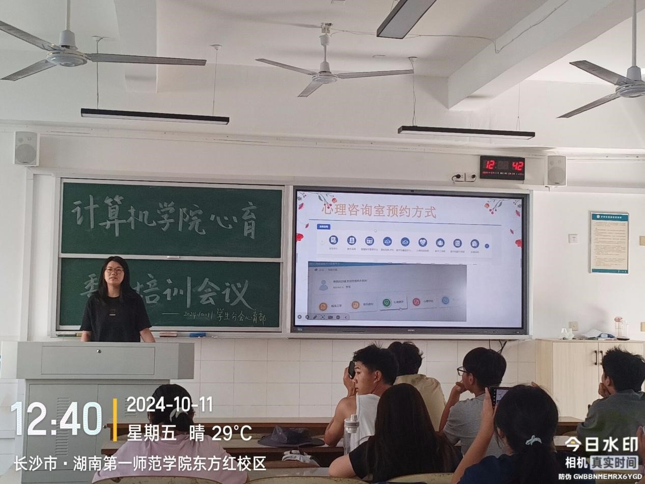 心育部负责人周亚暄从心理健康知识的宣传技巧、心理状况排查方法、如何为同学提供有效的心理支持等方面进行了讲解。她强调,心育委员在发现同学情绪、行为异常时,应在第一时间报告老师,并为这些同学提供必要的帮助。