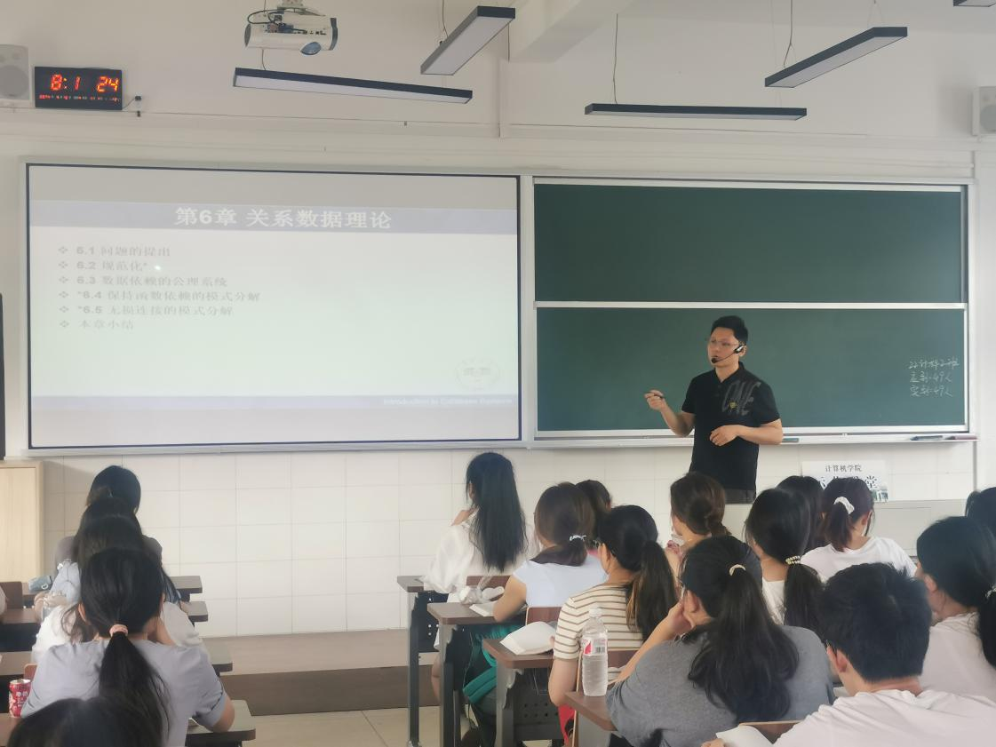 5月16日上午,林开彬在玉衡楼506为22计科2班的同学主讲了《数据库原理及应用》课,内容是关系数据理论中的函数依赖。林开彬利用思维导图的形式回顾了数据库完整性的相关内容,为本节内容的讲授做了较好的铺垫。他通过高校应用开发中的实例引出关系数据理论的必要性,极大地激发了学生的学习兴趣。整堂课上,林开彬教学的亲和力使课堂氛围轻松愉快,学生们的听课效果较好
