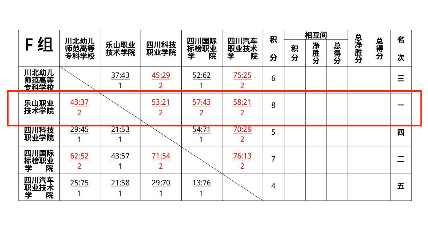 乐职女篮小组赛首战四川汽车职业技术学院,队员们以严密的防守和快速的攻守转换,使得对手难以找到有效的得分机会,以58:21大比分获得开门红,为接下来的比赛奠定了信心和决心。次战对阵四川科技职业学院,球员们赛前在战术和体能上准备充分,比赛中,乐职女篮继续保持稳定的发挥,全场紧逼防守,上半场领先29分,全场以53:21获胜。第三场与四川国际标榜职业学院相遇,乐职女篮在两名主力受伤离场,一名主力犯满罚下的情况下,凭借顽强的意志和扎实的体能基础,最终以57:43战胜对手。