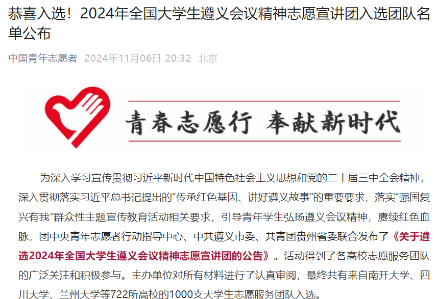 2024年11月6日,中国青年志愿者官方微信公众号公布了《2024年全国大学生遵义会议精神志愿宣讲团入选团队名单》,beat365英国官方网站中医康养学院“遵义青锋”志愿宣讲团成功入选。