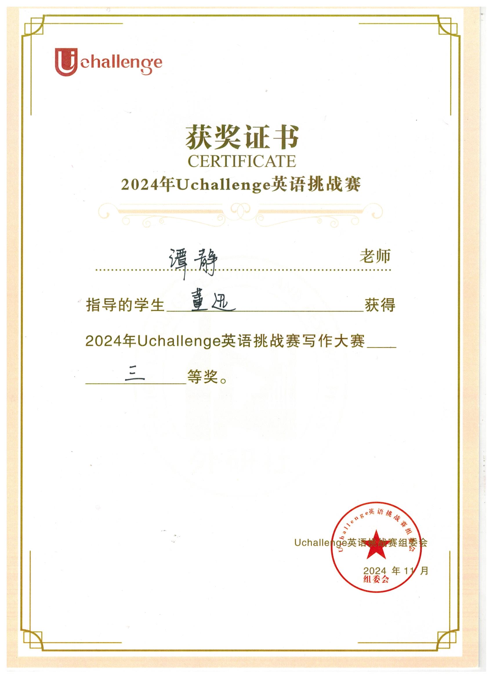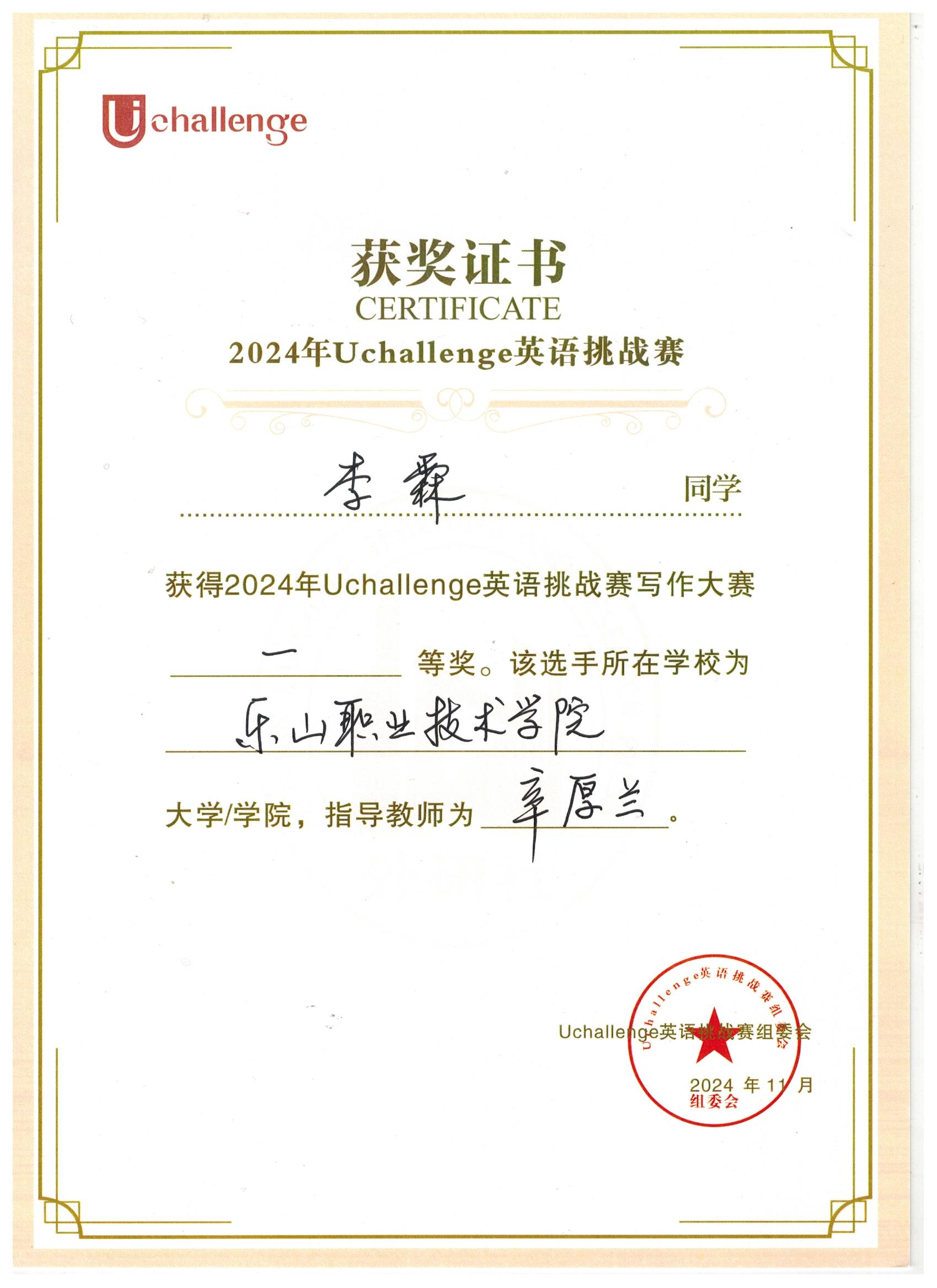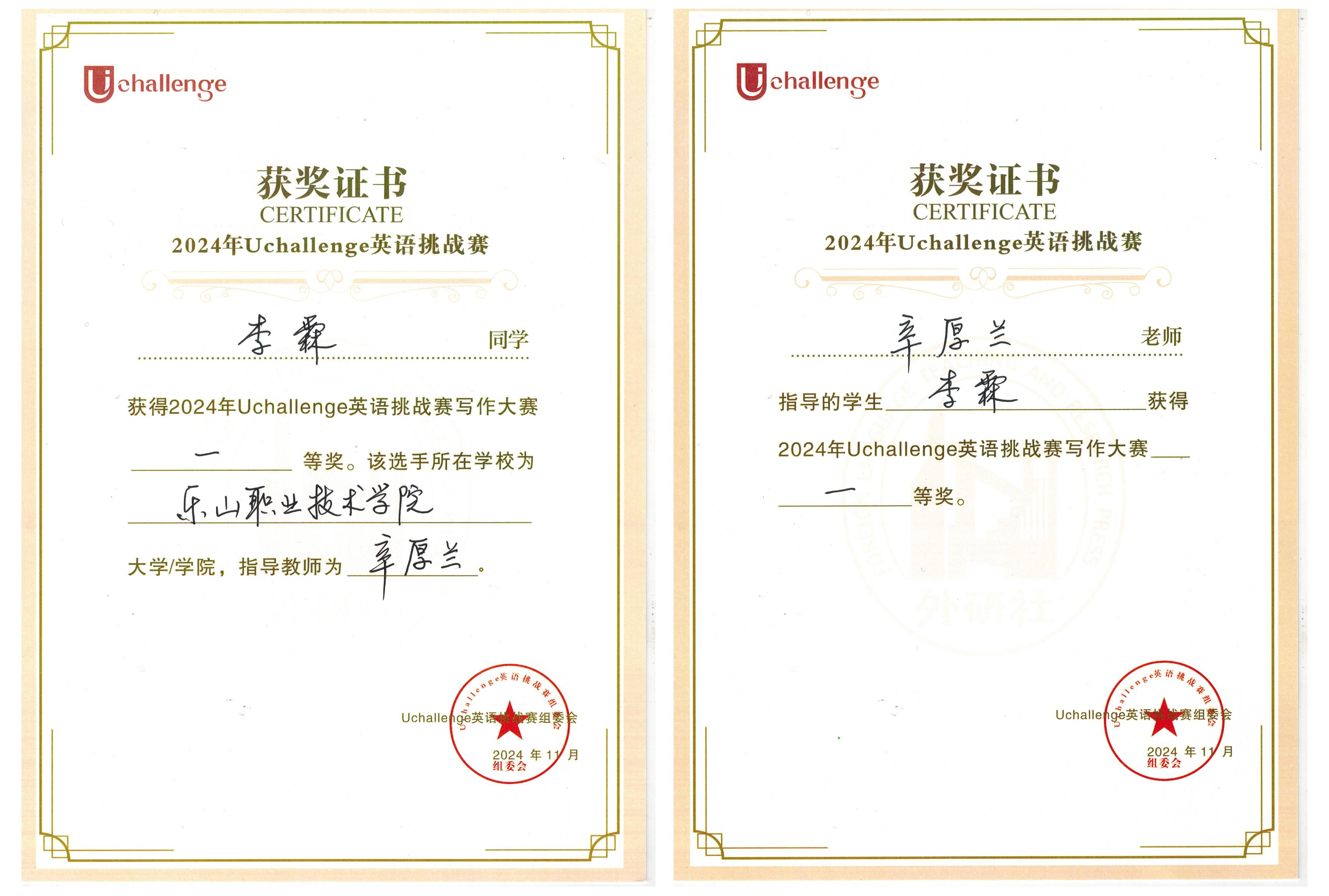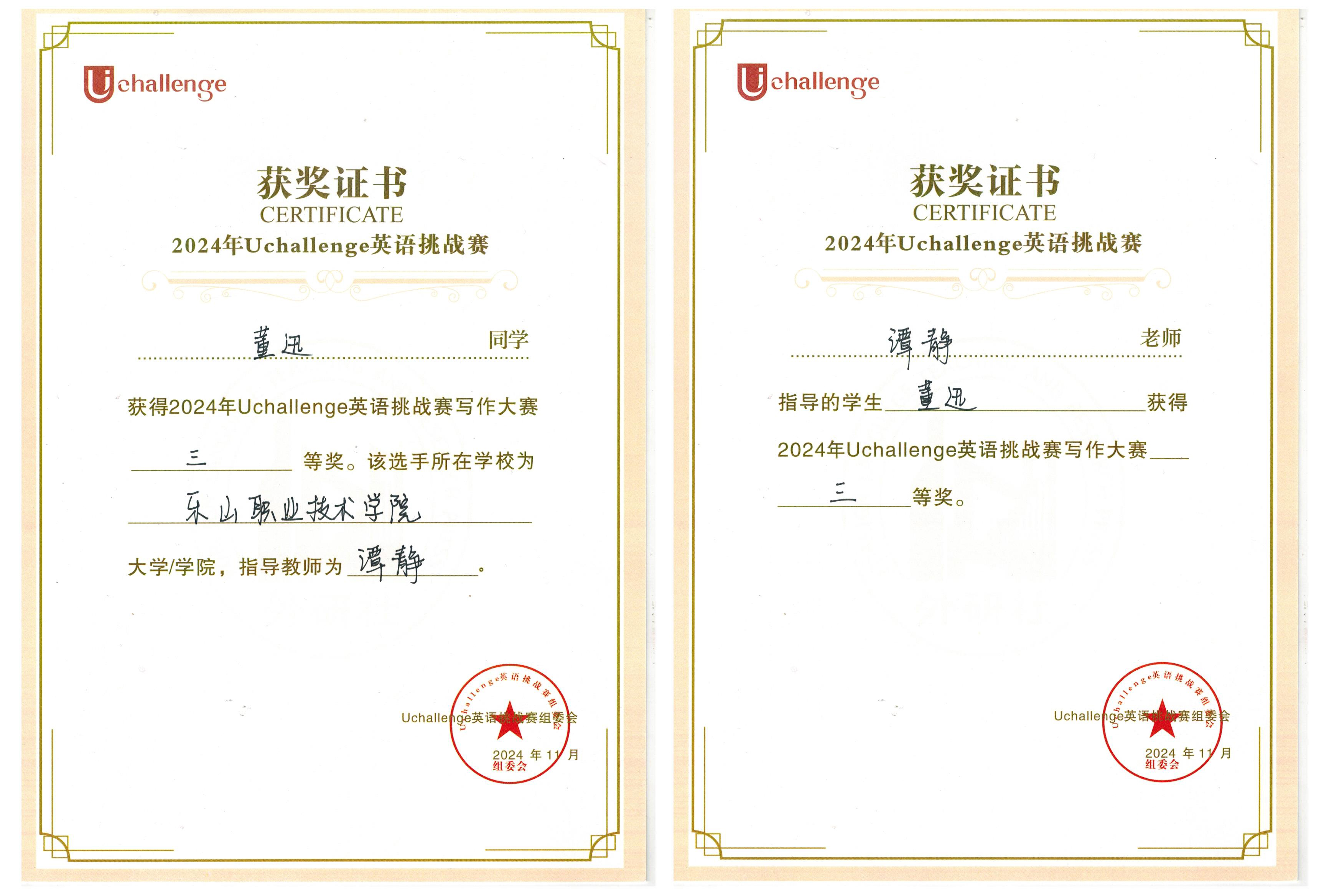 11月30日,2024年四川省高等职业院校Uchallenge英语挑战赛决赛在四川工程职业技术大学落幕。beat365英国官方网站临床医学学院口腔专业2024级1班学生王彩林在英语挑战赛(英语演讲比赛)中,获得一等奖并晋级国赛。在英语挑战赛(英语写作比赛)中,中医康养学院中医专业2023级1班学生李霖获得一等奖、数字经济与管理学院会计专业2023级3班学生董迅获得三等奖。