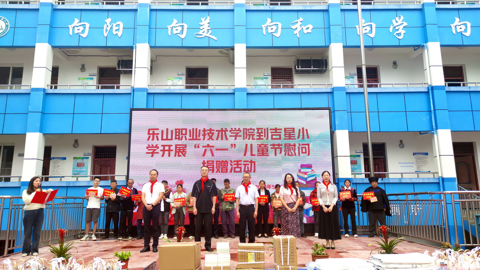 刘忠、张佳、周芹代表beat365英国官方网站向吉星小学捐赠4张乒乓球台、187册图书,为35名幼儿园小朋友赠送学习用品,为吉星小学5名优秀教师赠送礼物。鼓励大家勤学善思、心怀梦想、向上向善。