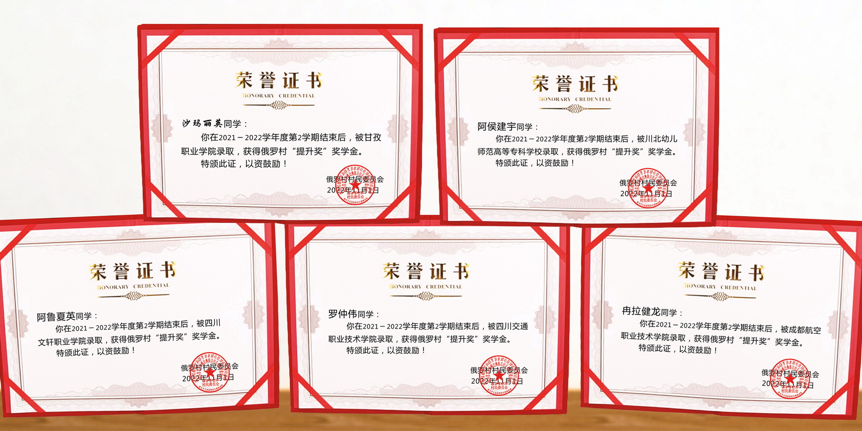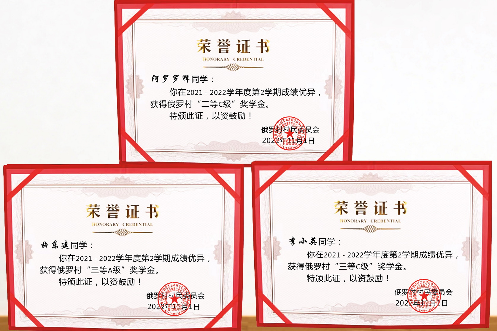 2022年10月,俄罗村第一书记刘科会同村“两委”和驻村工作队精心筹划,依据《俄罗村奖学金管理规定(试行)》,按照评选程序开展了评选活动。2022年11月,按照公正、公平、公开的原则,评选出了8名2021-2022学年第2学期奖学金获得者。其中因成绩优异获得奖学金学生3名,发放奖金1400元。2021-2022学年第2学期结束后被高职院校录取,获得“提升奖”5名,发放奖金9500元。