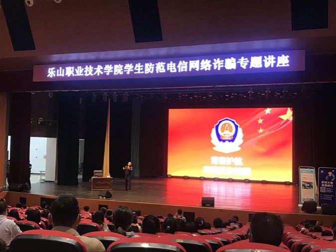 乐山市公安局刑侦支队反诈中心副大队长郑好首先作了防范电信(网络)诈骗宣讲。郑队长让同学们关注公众号、观看防(受)骗视频、关注视频号,所宣讲内容让全体师生身临其境,提高了同学们的防诈骗意识和能力。乐山移动嘉州分公司副总经理杨海随后为同学们对出售、出租、出借手机卡的危害进行宣传。他们的宣讲,都是以师生喜闻乐见的方式进行的,内容丰富,又别开生面,生动形象,让听众收获颇多。