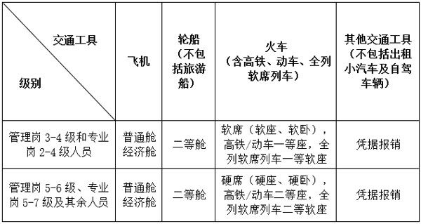 第八条 出差人员应当按规定等级乘坐交通工具。乘坐交通工具的等级见下表: