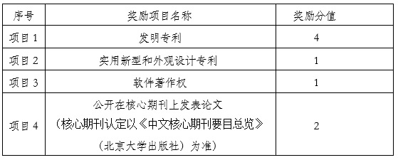 (3)凡符合选拔基本条件的专科生在校期间,以就读院校为第一完成单位且以考生本人为第一完成人获得发明专利、实用新型专利、外观设计专利、软件著作权、公开在核心期刊上发表与专业相关的论文,按下表给予奖励分。项目1、项目2、项目3、项目4 奖励分值可同时获得;多次获得同一项奖励项目,分值可累计。