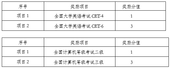(5)凡符合选拔基本条件的专科生在校期间,若通过以下考试,按下表给予奖励分。项目1、项目2 奖励分值不可同时获得,以奖励分值高者计算。