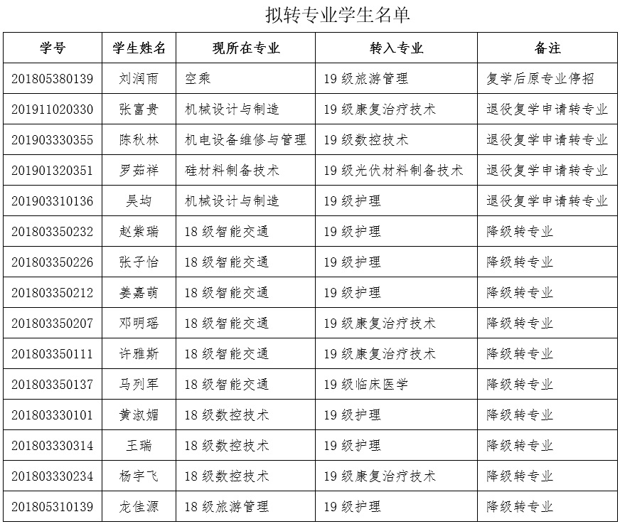 根据《beat365英国官方网站普通专科学生转专业管理办法(修改)》乐职院通[2019]49号文件精神,经学生自愿提出申请,转专业工作领导小组审批,拟同意以下同学转入旅游管理、康复治疗技术等专业学习(见下表),公示期为9月18日-20日。对拟转专业结果有异议者,请本人在公示期内将相关材料以书面形式报送到学院教务处,联系电话:0833-2273201。