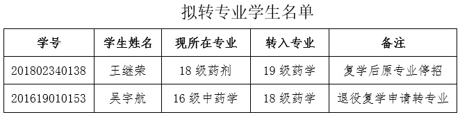根据《beat365英国官方网站普通专科学生转专业管理办法(修改)》乐职院通[2019]49号文件精神,经学生自愿提出申请,转专业工作领导小组审批,拟同意以下同学转入药学专业学习(见下表),公示期为10月9日-11日。对拟转专业结果有异议者,请本人在公示期内将相关材料以书面形式报送到学院教务处,联系电话:0833-2273201。