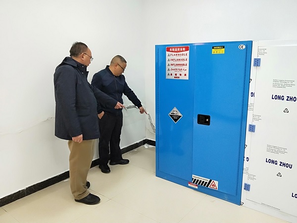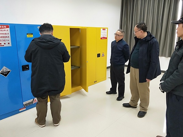 在检查过程中,张学河指出:危化品存放室内的危化品柜的摆放务必按要求执行,同时考虑楼层承重、避免阳光照射等因素;危化品的存放应严格按照相关制度分类放置入柜;按照学院危化品管理文件要求严格出入库及领用登记,专人专管,废弃液集中存放统一处理。做到每日巡查,发现问题及时处理,加大对老师及同学的安全教育,规范实训室内实训操作,避免危险事故的发生。