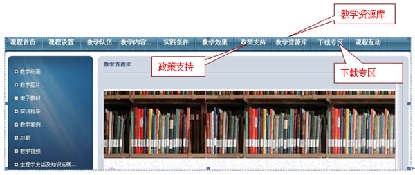 (一)为满足课程资源库建设的需要,各课程网站请单独设立“教学资源库”一级栏目,将相关资源统一放置。(类似于生理网站,如下图)