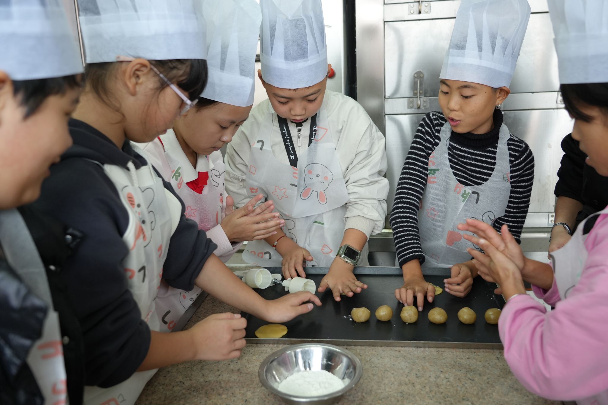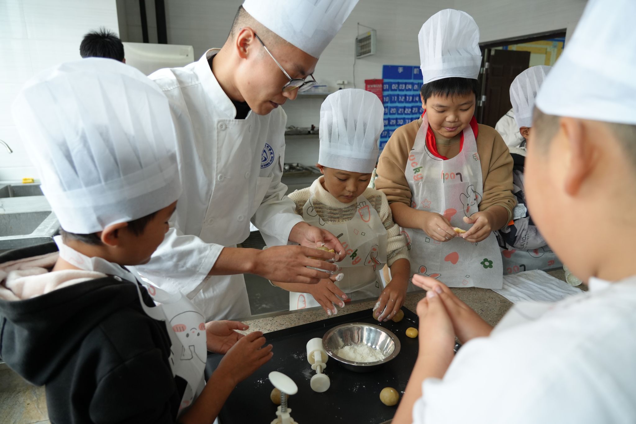 时值深秋,活动的另一大亮点是传统月饼的制作体验。在月饼制作工坊,同学们了解了月饼作为传统节令点心所承载的文化意义。面点师傅现场演示了从和面、制馅到包制、压模的全过程。同学们纷纷挽起袖子,化身“小小面点师”,揉搓面皮、包裹馅料、压模成型。这一环节不仅锻炼了大家的动手能力,更让他们对传统糕点制作所蕴含的匠心精神有了切身的体会。