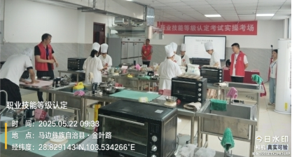 2025年5月22日,文化旅游学院烹饪专业教师刘海应邀参加乐山嘉州美食文化研究院在马边公共实训基地举行的西式面点师职业技能等级认定,乐山市德艺学校在马边的培训班学员共18人分两轮参加了西式面点师五级的职业技能等级认定考核。