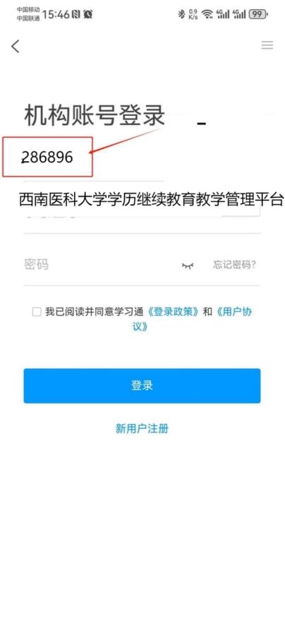 3. 单位UC码/单位名称输入: 286896 然后选择弹出来的 “西南医科大学学历继续教育教学管理平台”