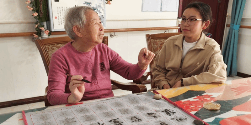 活动中志愿者们陪伴老人聊天、宣讲健康知识,还陪同老人们一起做康复操,还有老人教志愿者练书法,现场充满了欢声笑语。