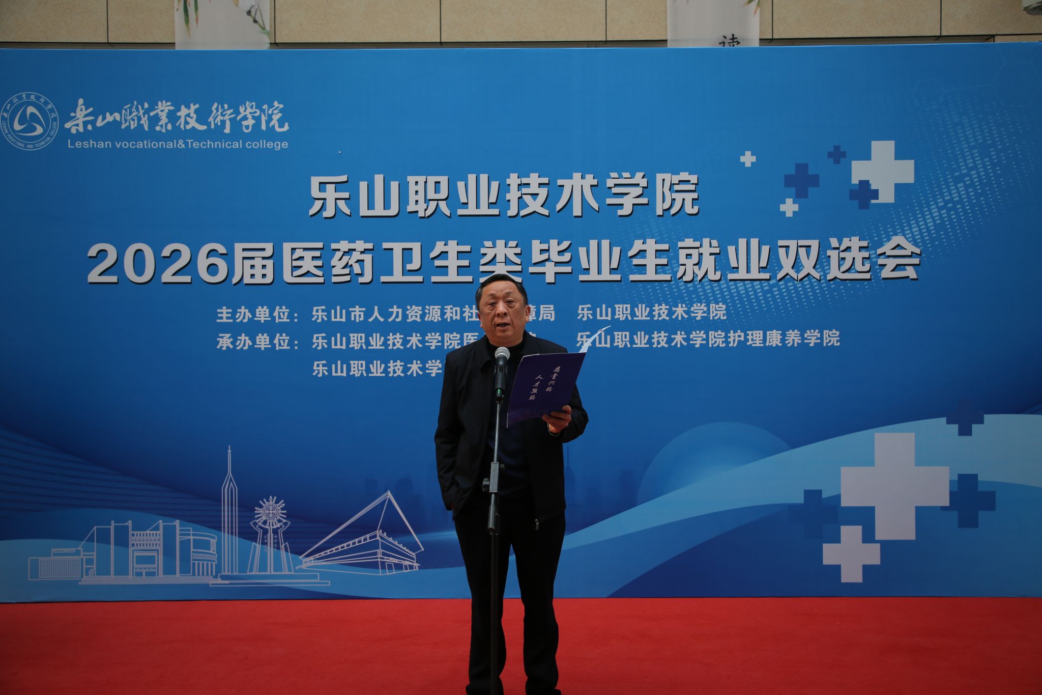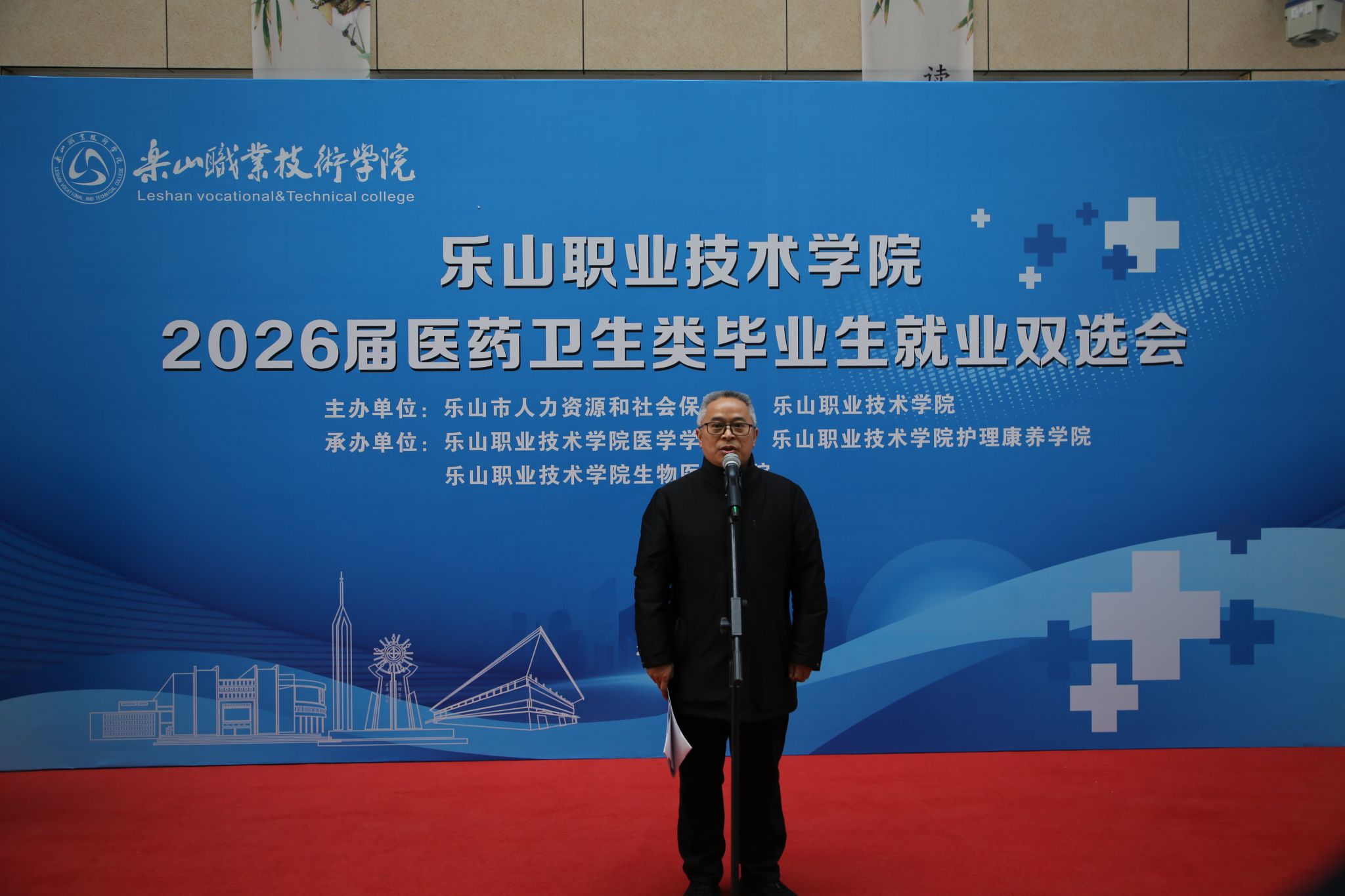 春启新程聚英才,校企携手促就业。2026年1月9日9:00-12:00,beat365英国官方网站2026届医药卫生类毕业生就业双选会顺利举行。乐山市人力资源和社会保障局二级巡视员黄卫东出席活动并致辞,参会企业代表、学院师生代表共同参与。